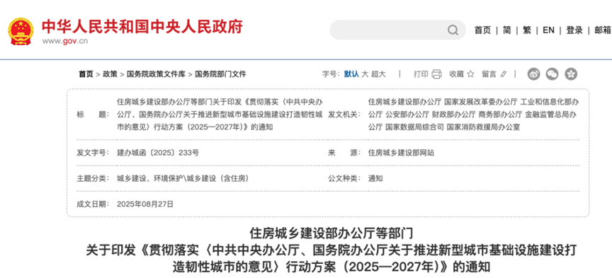 近日,住房和城乡建设部、国家发展改革委、国家数据局等 9 部门制定了《贯彻落实〈中共中央办公厅、国务院办公厅关于推进新型城市基础设施建设打造韧性城市的意见〉行动方案(2025—2027年)》(建办城函〔2025〕233号)。《行动方案》从推动实施智能化市政基础设施建设和改造、推动智慧城市基础设施与智能网联汽车协同发展、发展智慧住区、提升房屋建筑管理智慧化水平、开展数字家庭建设、推动智能建造与建筑工业化协同发展、完善城市信息模型(CIM)平台、搭建完善城市运行管理服务平台八方面细化落实举措。