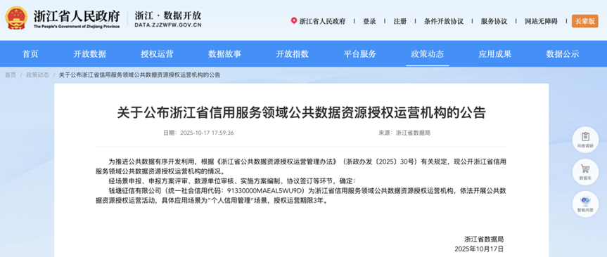 10月17日,浙江省人民政府官网发布信息,钱塘征信有限公司成为浙江省公共数据授权运营商,将建设全国首个融合公共数据的面向个人的可信数据空间。此举可视为浙江探索“个人信用经济”新赛道、释放数据要素价值的先行先试。