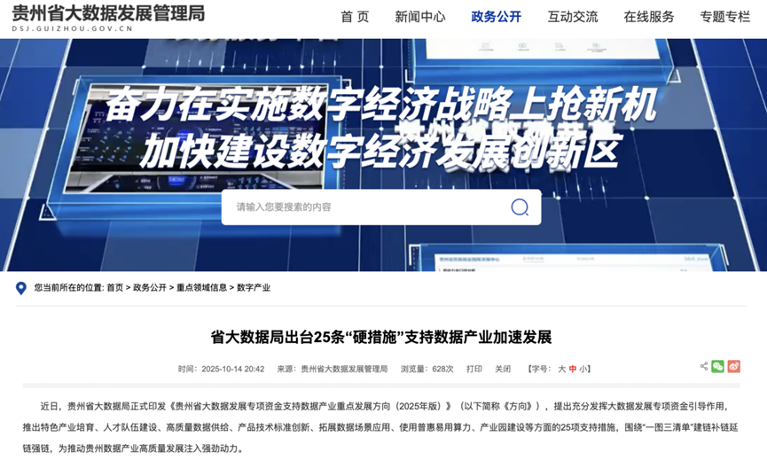 10月14日,贵州省大数据局正式印发《贵州省大数据发展专项资金支持数据产业重点发展方向(2025年版)》,推出七大领域共25条具体支持措施。该政策旨在通过专项资金引导,围绕“一图三清单”建链补链延链强链,推动数据产业高质量发展。