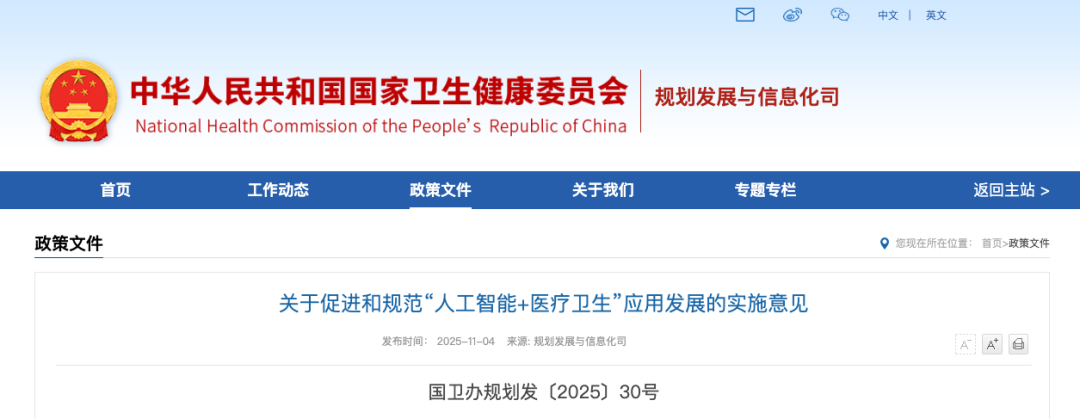 2.国家卫生健康委办公厅、国家发展改革委办公厅等五部门联合发布《关于促进和规范“人工智能+医疗卫生”应用发展的实施意见》