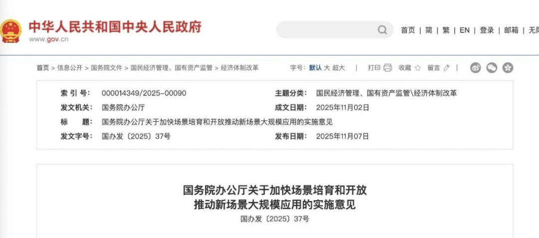 11月2日,国务院办公厅印发《关于加快场景培育和开放推动新场景大规模应用的实施意见》,提出22类场景培育和开放重点领域。其中包括数字经济领域和人工智能领域的多个场景方向。《意见》也提出,将围绕数字经济、人工智能、全空间无人体系、生物技术、清洁能源等新领域新赛道,以及制造业转型、智慧城市、民生服务等重点方向,系统性培育和开放一批综合性、高价值应用场景。《意见》强调要加大各类场景资源开放力度,促进公平高效配置,并强化政策与要素保障,打通“技术突破-场景验证-产业应用”的关键路径。