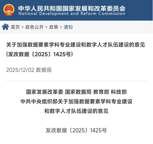 12月2日,国家发展改革委、国家数据局、教育部、科技部、中共中央组织部等五部门联合发布《关于加强数据要素学科专业建设和数字人才队伍建设的意见》。《意见》指出数据要素学科专业建设和数字人才队伍建设,承担着培养深化数据要素市场化配置改革和数据赋能人工智能高质量发展所需各类人才的重大使命,是统筹推进数字中国、数字经济、数字社会规划和建设的重要基础。《意见》聚焦数据要素学科专业、数据行业职业教育、数据领域学术研究、数据领域产学研用协同四个方面,系统部署12项重点任务。
