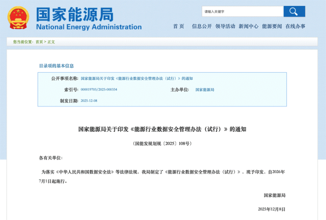 12月12日,由国家能源局印发的《能源行业数据安全管理办法(试行)》正式公布,并将于2026年7月1日起施行。作为能源行业落实《中华人民共和国数据安全法》的重要规范性文件,这一新规为能源行业数据安全提供了明确指引。