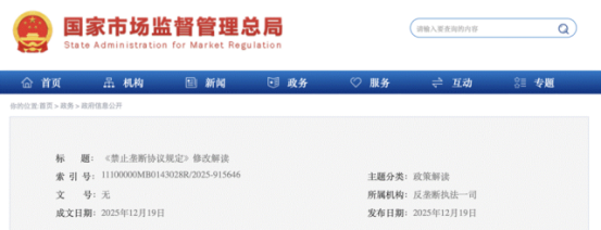 12月19日,国家市场监管总局修改《禁止垄断协议规定》,明确不予禁止的纵向垄断协议需符合的市场份额标准和其他条件,将于2026年2月1日起施行。