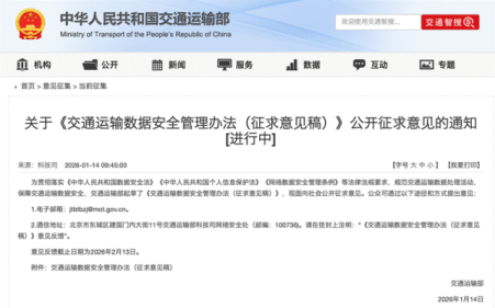 1月14日,交通运输部发布《交通运输数据安全管理办法(征求意见稿)》。该文件拟建立交通运输数据分类分级保护制度,将数据分为一般、重要、核心三个级别,并对数据收集、存储、使用、传输等全生命周期环节提出安全管理要求。文件明确了“谁管业务、谁管数据安全”的责任原则,强化数据处理者主体责任,并建立数据安全风险评估、监测预警与应急处置机制。旨在保障交通运输数据安全,促进数据依法有序流通利用。