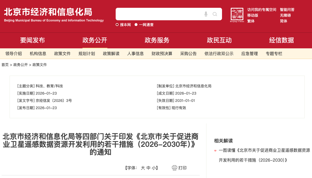 1月23日,北京市经济和信息化局,北京市科学技术委员会、中关村科技园区管理委员会、北京市规划和自然资源委员会、北京市政务服务和数据管理局联合印发《北京市关于促进商业卫星遥感数据资源开发利用的若干措施(2026-2030年)》,这也是国内首个商业卫星遥感数据资源开发利用专项政策。该《若干措施》聚焦遥感数据资源全生命周期开发利用,提出14项具体举措,构建起全方位政策支撑体系。