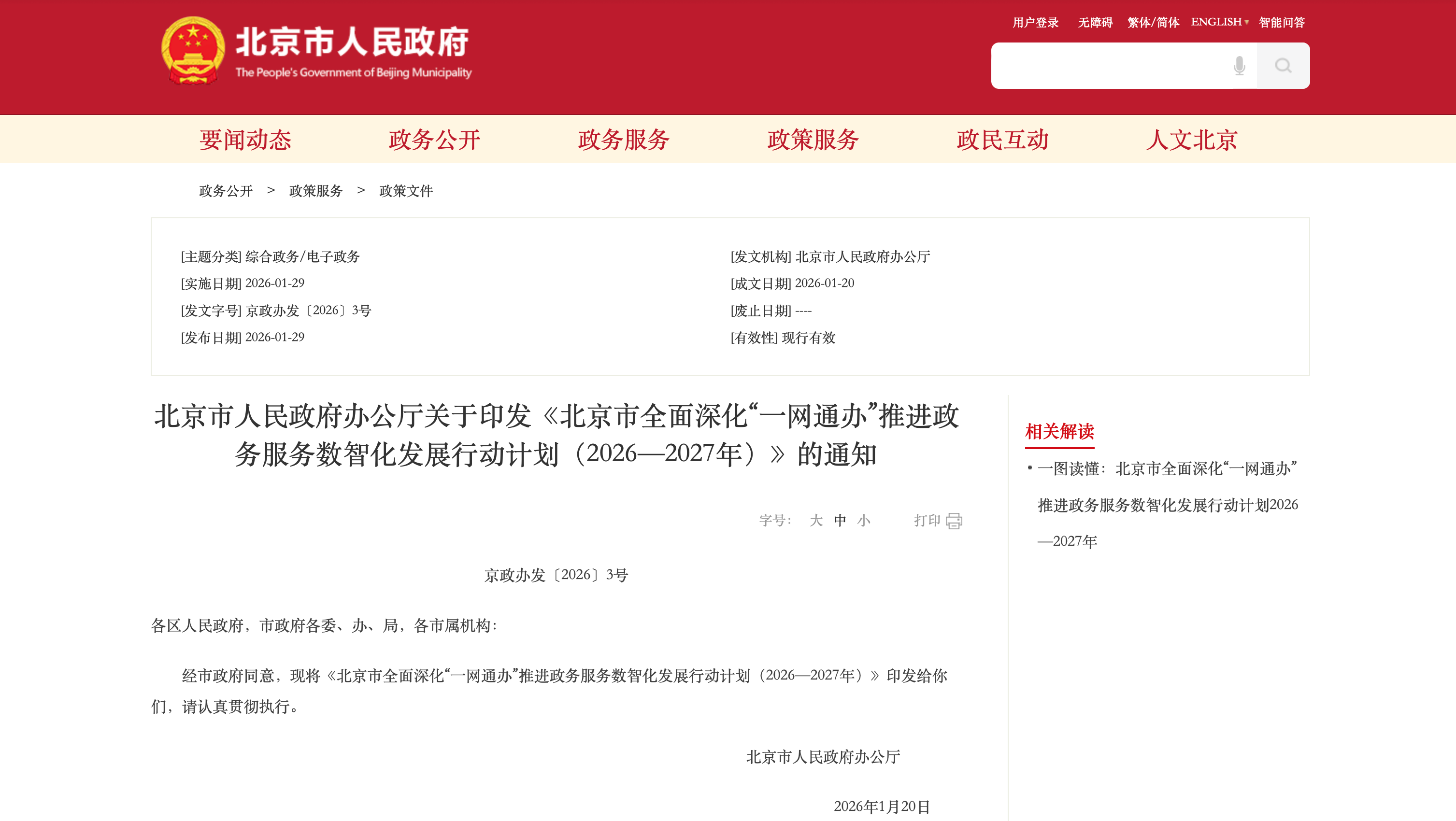 2、《北京市全面深化“一网通办”推进政务服务数智化发展行动计划(2026—2027年)》发布
