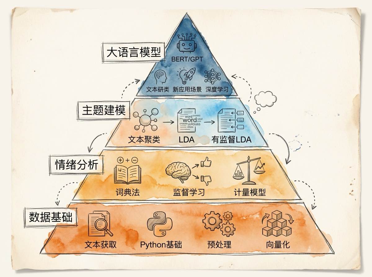 本课程旨在系统讲授如何利用自然语言处理(NLP)技术,从海量财经文本(如上市公司年报、财经新闻、央行沟通、社交媒体)中提取有效信息,并将其转化为可用于经济学实证研究的结构化数据。课程内容涵盖从数据获取到前沿应用的完整流程:首先介绍Python文本爬虫与数据预处理技术;进而深入讲解词向量表示(Word2Vec)、基于词典与计量模型的情绪分析方法、以及文本聚类与主题模型(LDA)。此外,课程紧跟技术潮流,专门探讨大语言模型(BERT/GPT)在文本相似性计算、经济信念模拟及推理中的创新应用。